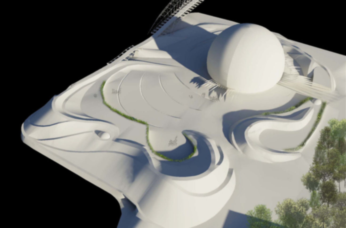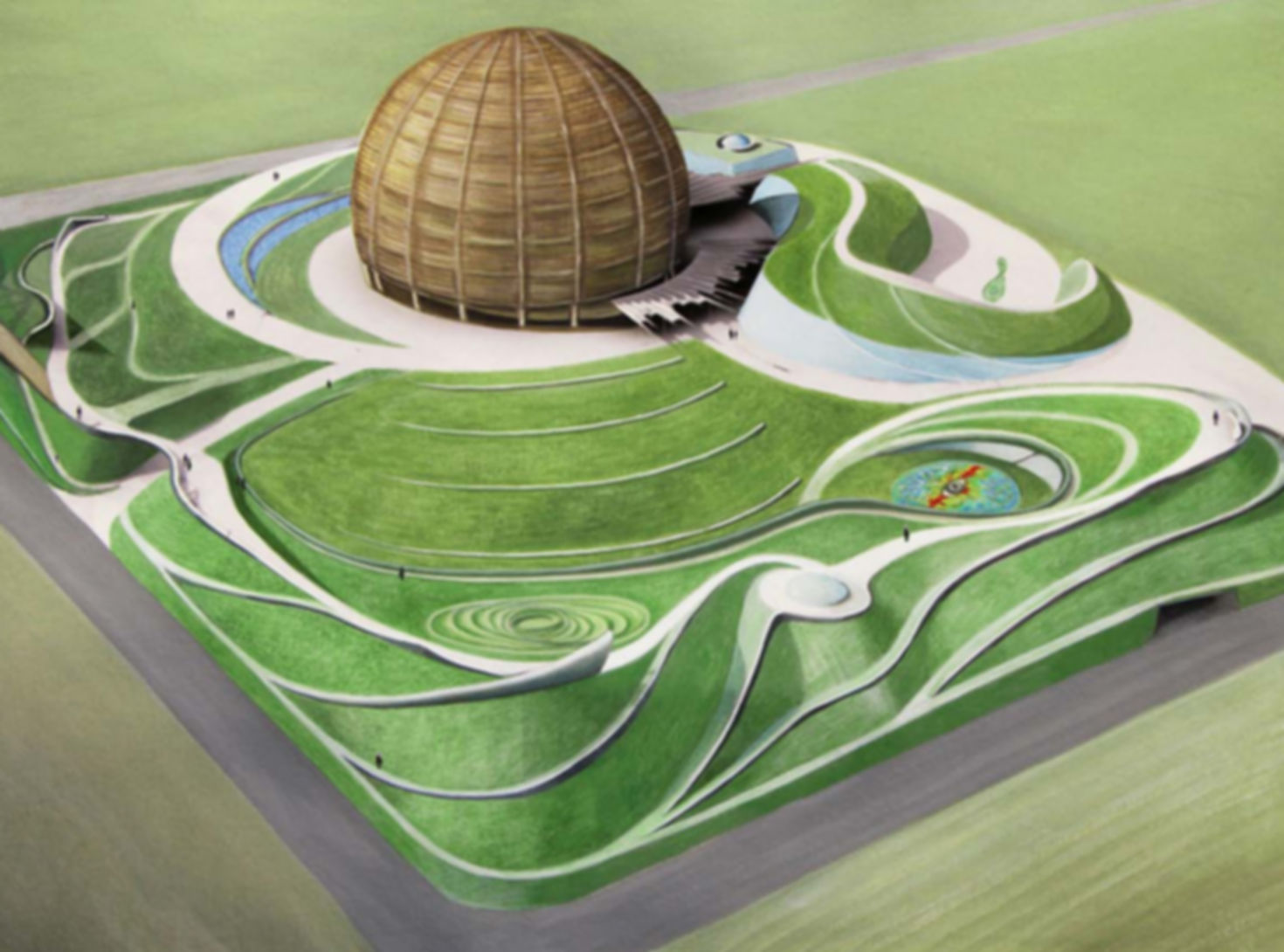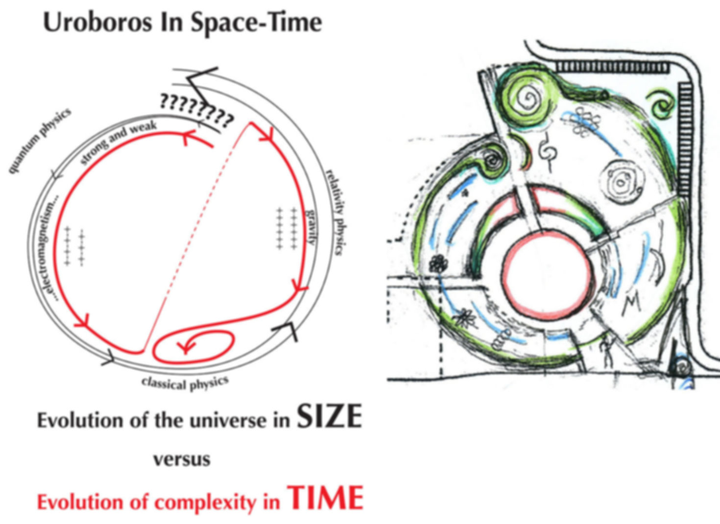 Green Oasis, landforms and underground buildings for CERN. The design surrounds The Globe and protects it from the high speed traffic to its south, providing a buffer to noise and industrial landscape impinging from any side. To communicate the discoveries at Cern we have developed two iconographic programmes. One concerns a circular walk of mounds around the edge of the site based on the cosmic uroboros. These also depict the units of the universe at all sizes growing from the tiniest objects to the universe as a whole. This 'ring' relates to a 27 kilometre underground accelerator and the fact that the universe has architectural structure from the quark to the great wall of gallaxies. The second set of symbols present the everyday collisions of the accelerator as a striking icon, which relates directly to the measuring instruments that surround the explosions. Also it is a good analogy of the eye which measures the universe - a new eyeconology.