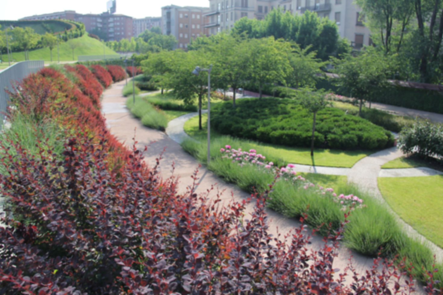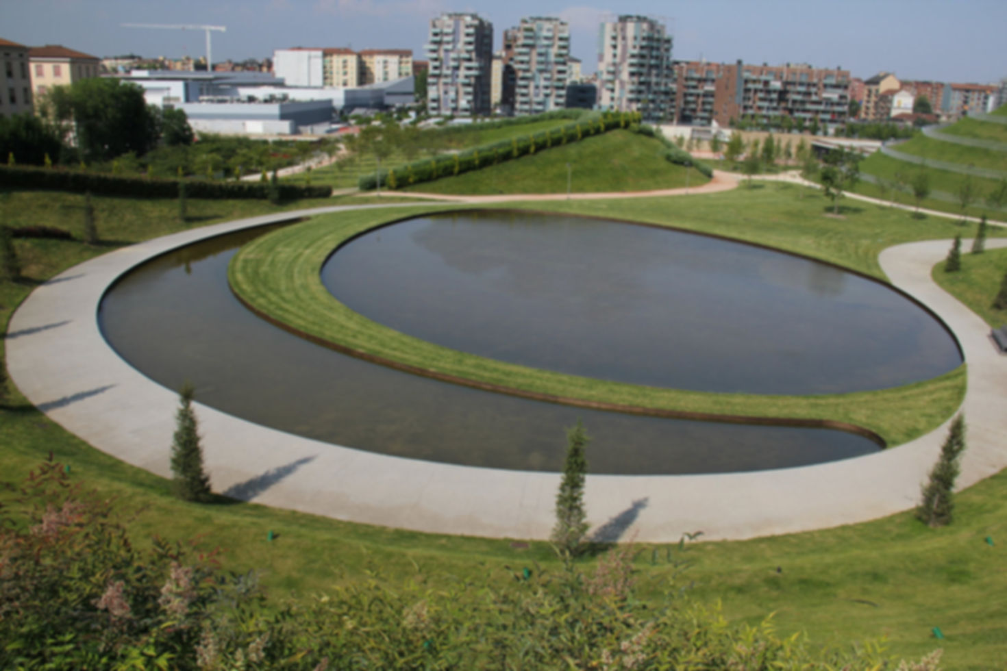 An urban park in northwest Milan with three major landforms, ponds, gardens, and sculpture.
