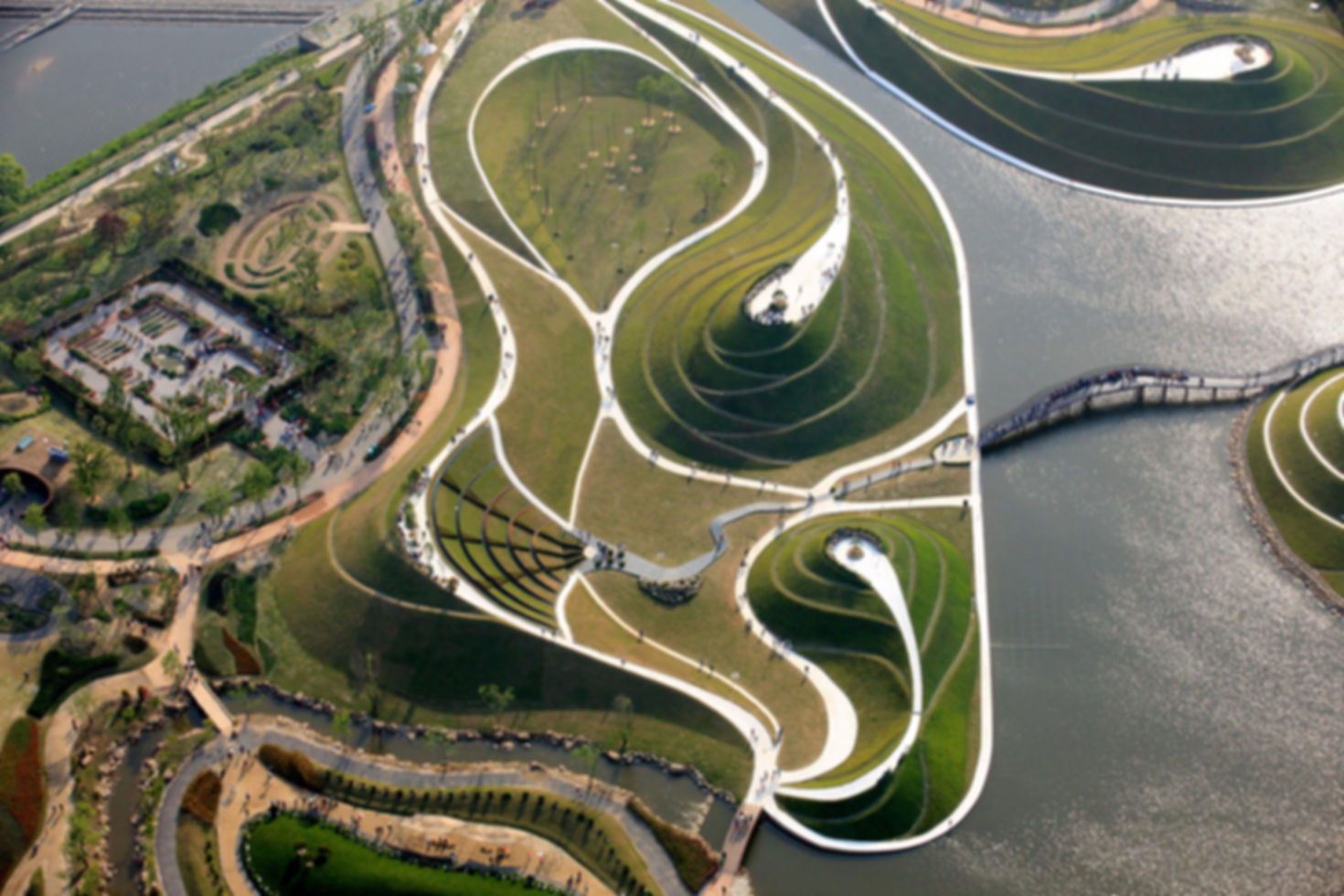Mountains and water at the heart of the Suncheon Eco-city, Korea, 2013. Mountains in this southern city have created a unique wetlands, celebrated in the Eco-Geo Festival of 2013. But, in a country that is 70% mountainous, this ecological duality has often remained below consciousness, so we have made it into two themes - Miniaturizing the Mountains and Holding the Eco-Line. That is, the sharp contrast between city and nature and the way mountains create their counterpart: riversand wetland deltas.